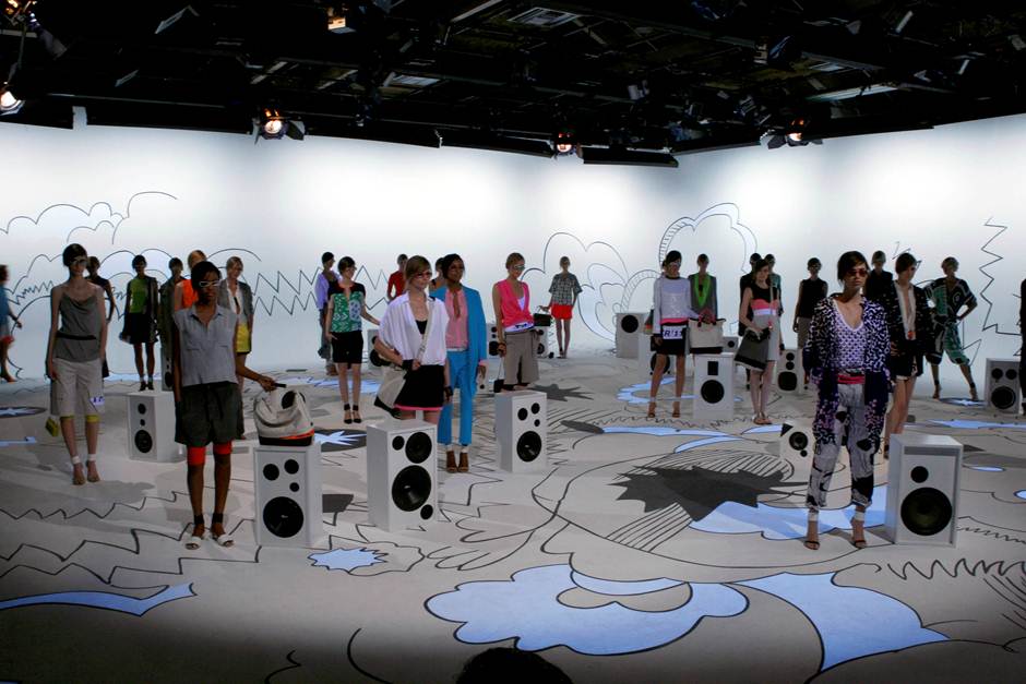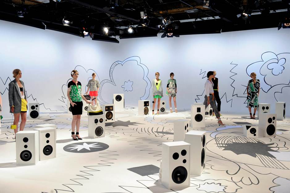Dès le début du défilé intitulé Wrapsody Rap, le ton est donné dans un esprit plus jeune inspiré par la street culture. Les mannequins ont présenté une pré-collection sportive au beau milieu d’enceintes stéréo posées ici et là dans un décor où murs et planchers étaient peints de graffitis noir et blanc. « Il y a un côté hip-hop dans cette collection mais avec une pointe de romantisme » explique Yvan Mispelaere. Cet esprit hip-hop se retrouve dans les différentes superpositions un peu lâches, dans les imprimés graphiques comme on le voit dans la première silhouette du défilé avec cette robe portefeuille à dominante verte laissant apparaître un soutien-gorge noir, ou encore avec la silhouette clôturant le défilé en anorak trop grand recouvrant un top à large encolure et un pantalon baggy.