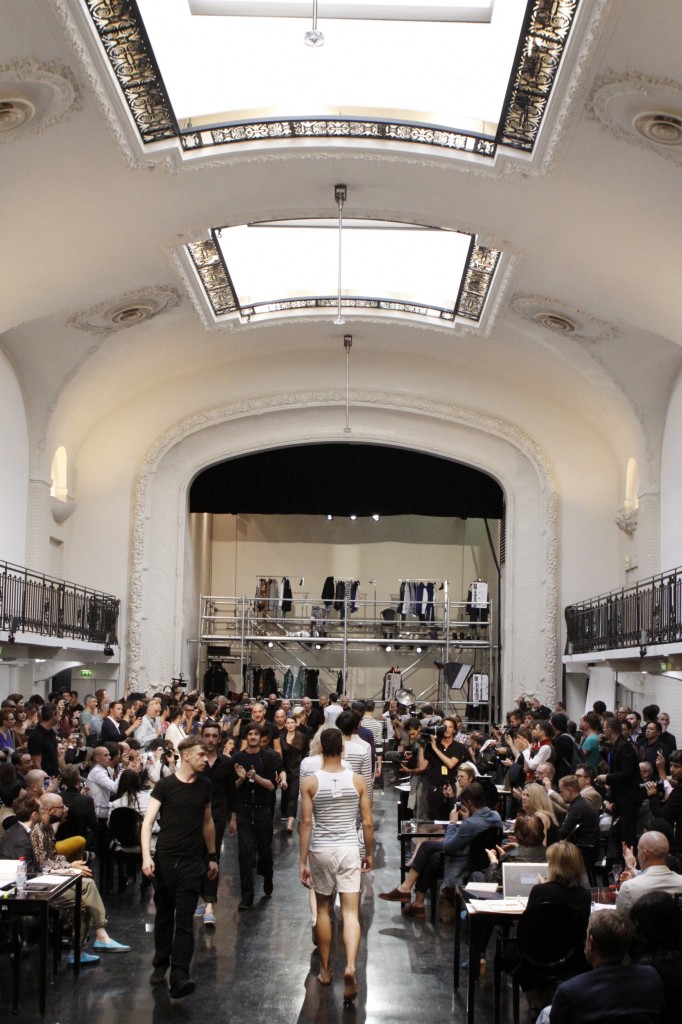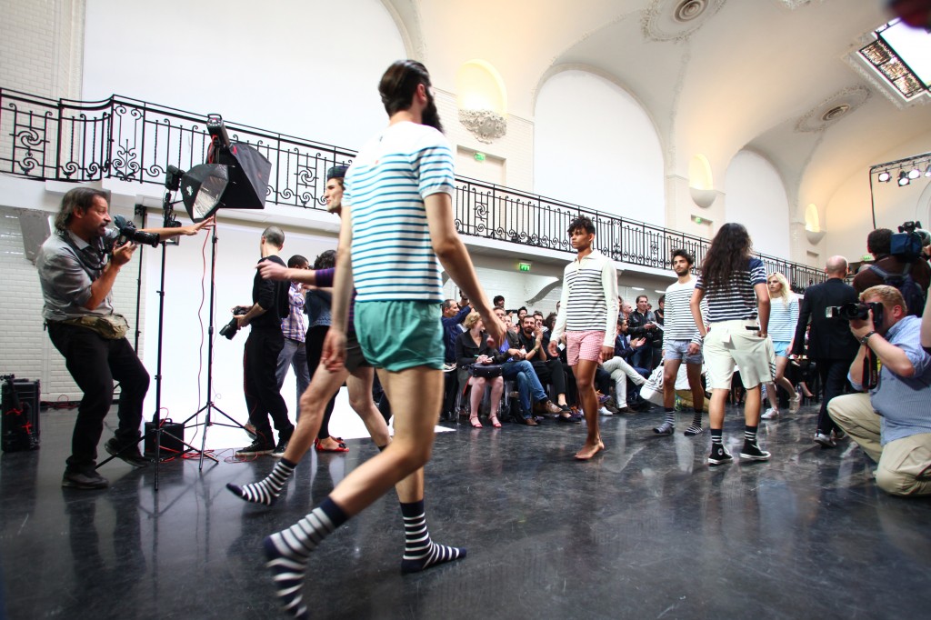 Entre défilé et show-room, la présentation de la collection Jean-Paul Gaultier Homme Printemps Eté 2012 fut un hommage aux premiers défilés où les modèles étaient présentés devant un parterre d’acheteurs. Retour en images sur l’une des présentations les plus originales, entre imprimé hawaïen et tartan, pièces classiques mixées avec d’autres moins conventionnelles. Et bien sûr, que serait un défilé Jean-Paul Gaultier sans la marinière ?