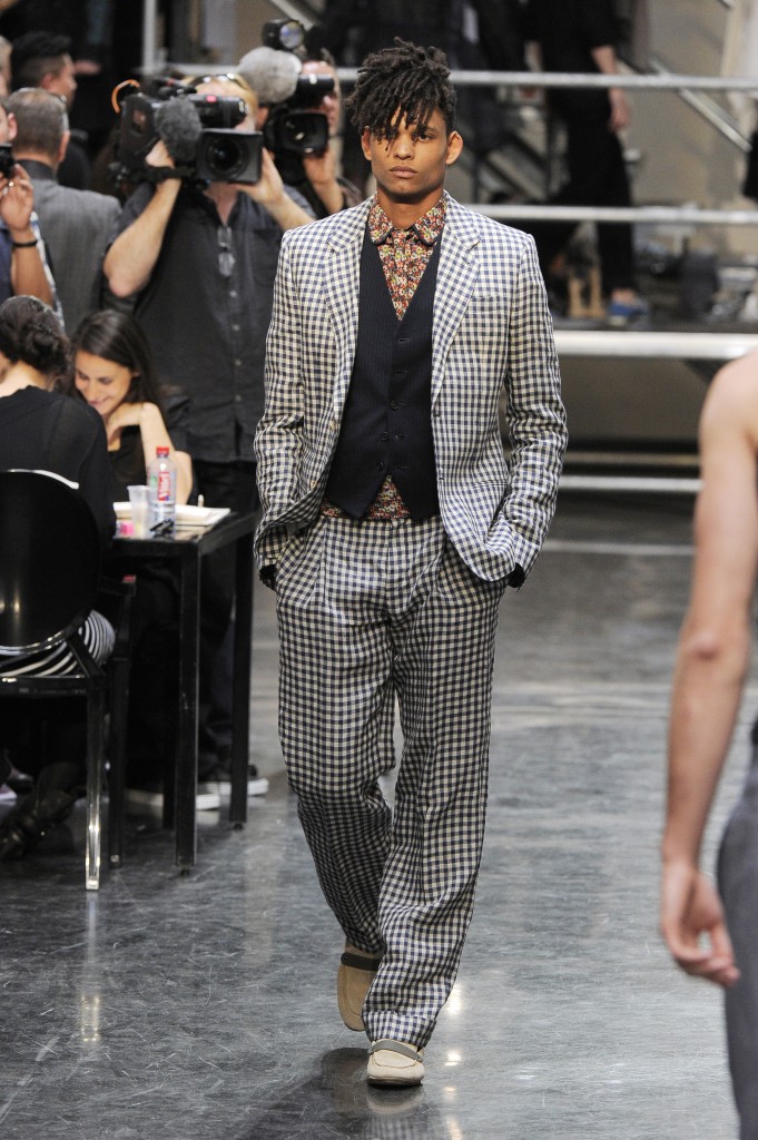 Sur l’échafaudage sur deux étages, mannequins et habilleurs s’affairent pour nous présenter un show de toute beauté. Les hommes se changent, tournant le dos aux invités, avant de venir au plus près du public, une voix détaillant leur tenue, les matières, les imprimés. Les mannequins en passant, enlèvent leurs vestes pour laisser aux invités l’opportunité d’admirer la qualité des matières employées. L’ambiance est un brin solennelle, les coulisses faisant partie du défilé, les vêtements portant encore leurs étiquettes.