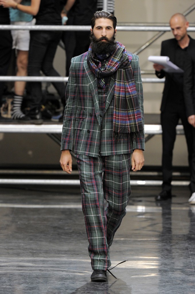 Le tartan, imprimé plutôt automnal, est réhabilité pour la saison estivale mais en version sombre où le vert prédomine. L’imprimé si cher à la marque s’empare en total look des parkas, des trenchs, des pantalons et offrent une seconde vie aux gilets traditionnels et à l’écharpe masculine pour une allure de dandy irréprochable. L’homme Jean-Paul Gaultier avoue un faible pour l’imprimé à carreaux, qu’il aime en caleçon ou en costume trois pièces porté de manière décalée avec une chemise à fleurs mais sur gilet noir.
