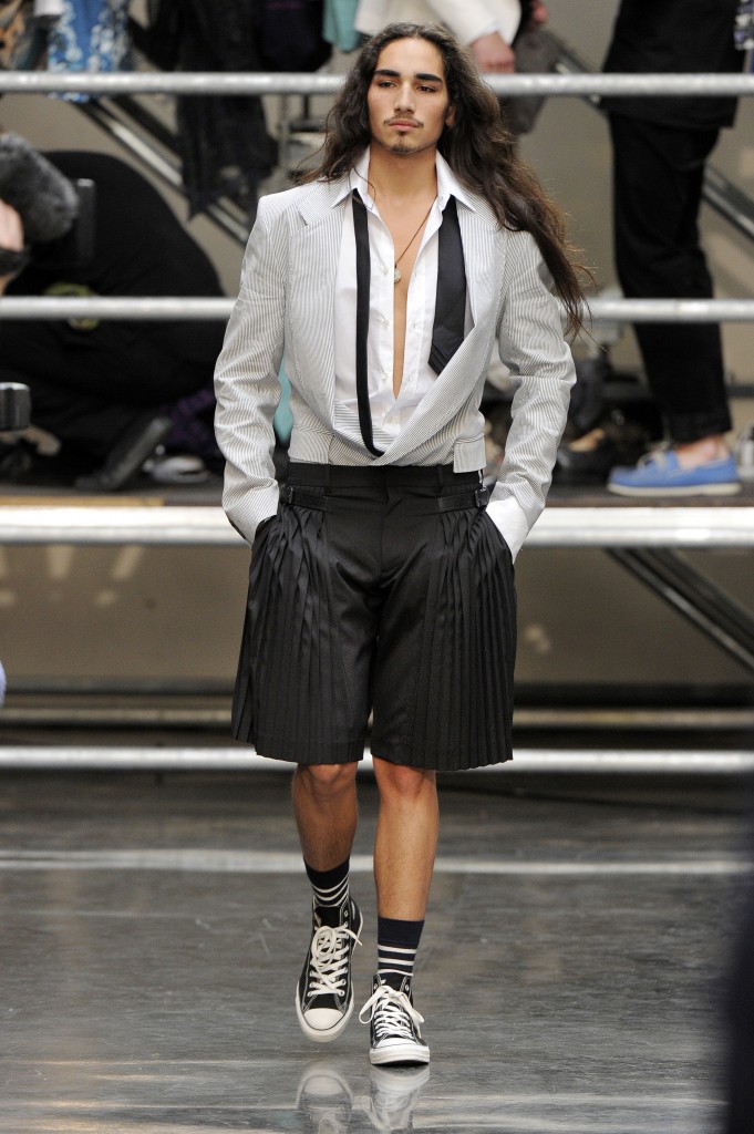 Le short plissé, dont la forme rappelle le kilt si cher au designer, se fait smoking porté cravate dénouée et converse aux pieds pour une allure chic mais décontractée. Et lorsqu’immaculé, il se pare de rayures bleues, c’est tout naturellement à un polo d’inspiration marine qu’il s’associe.