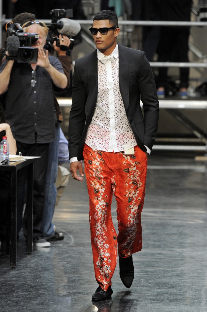 L’homme Jean-Paul Gaultier Printemps Été 2012 est un homme aimant l’élégance d’un costume parfaitement taillé mais qui assume sa part d’excentricité en osant le mixer avec des pièces plus décalées. Ainsi l’imprimé hawaïen a gagné les faveurs du designer. Paysages tropicaux ou fleurs d’hibiscus se retrouvent dans toute la collection en couleurs éclatantes : chemises, pantalons, bermudas, vestes et mêmes chaussures se parent d’un avant-goût de vacances.