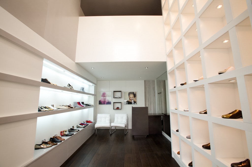 A peine entrée, je suis frappée par le design de la boutique, chic, élégante et sobre avec au mur des polaroïds géants de Maripol. D’emblée le lieu me plaît. Il ne ressemble en rien aux autres boutiques de chaussures dans Paris. Les modèles pour hommes sont délicatement présentés dans des caissons blancs tandis que de longues étagères abritent les créations pour femmes.