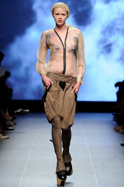 La femme Julien Fournié aime les transparences et les coupes fluides qui n’entravent aucun de ses mouvements. Elle se chausse de chaussures à semelle plateforme en liège façon creepers qui lui confère une démarche saccadée presque sur la pointe des pieds.