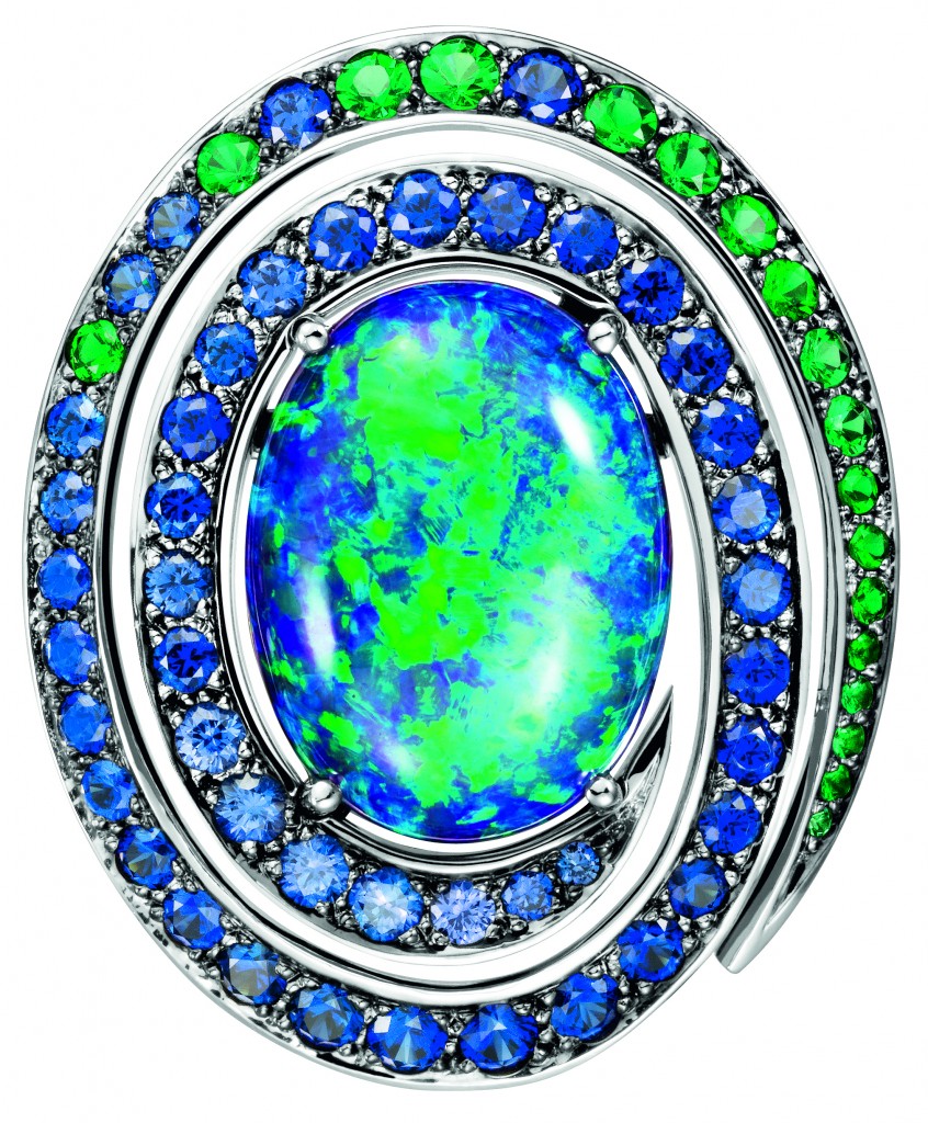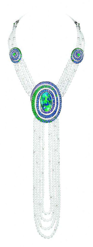 Écume de boules de cristal de roche et tourbillons d’opale entourent les vagues de saphirs, de diamants et d’émeraudes de la parure Aiguebelle, tout en légèreté.