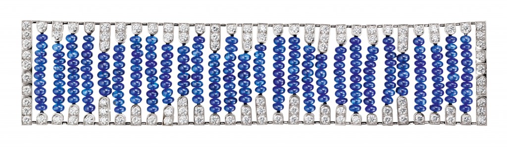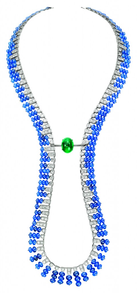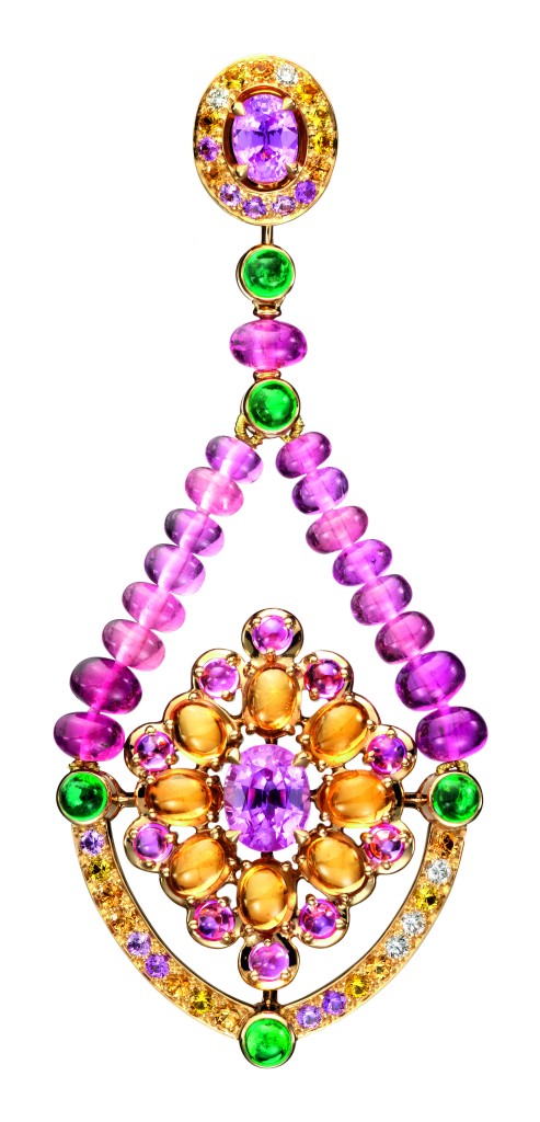 Ainsi un motif du Sautoir Isola Bella, pavé de rubis, d’émeraudes, de saphirs jaunes et roses et de diamants sur or jaune, se déplace le long de chaque côté du collier au gré des rangs de rubellite mais est également détachable pour se porter en bracelet.