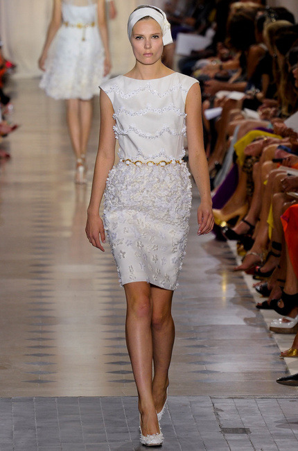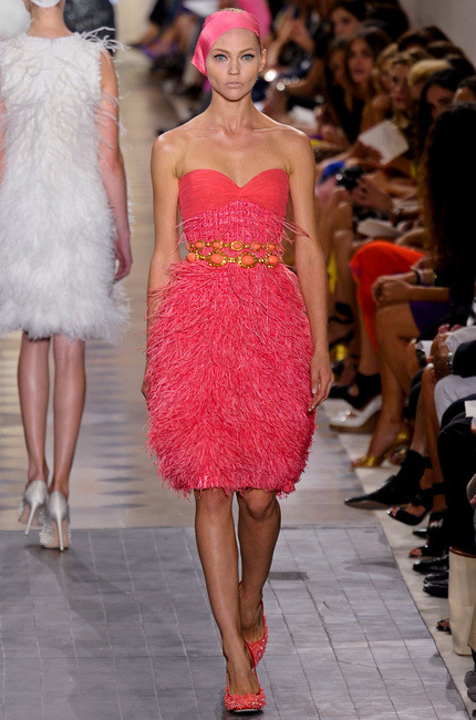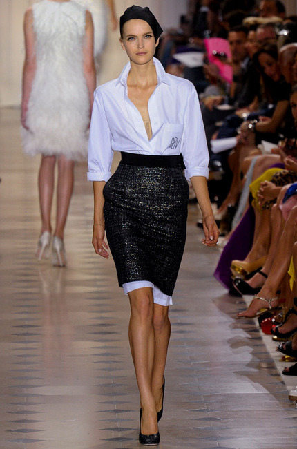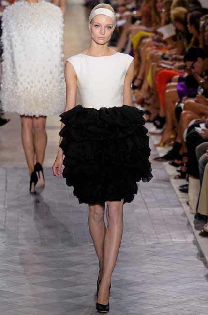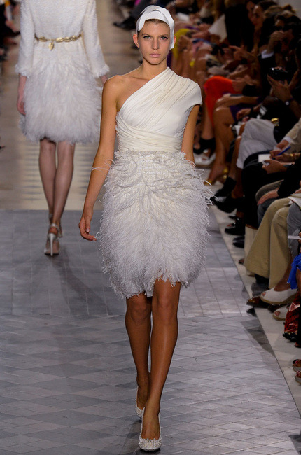 La femme Giambattista Valli apprécie les ornements comme la plume qu’elle soit d’autruche ou de faisan. Ainsi des plumes d’autruches réveillent la traditionnelle jupe en tweed de ruban lorsqu’elles ne sont pas remplacées par des clochettes de muguet en organza.
