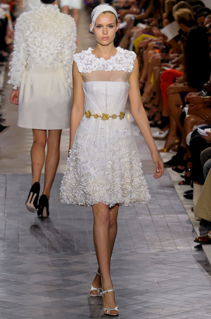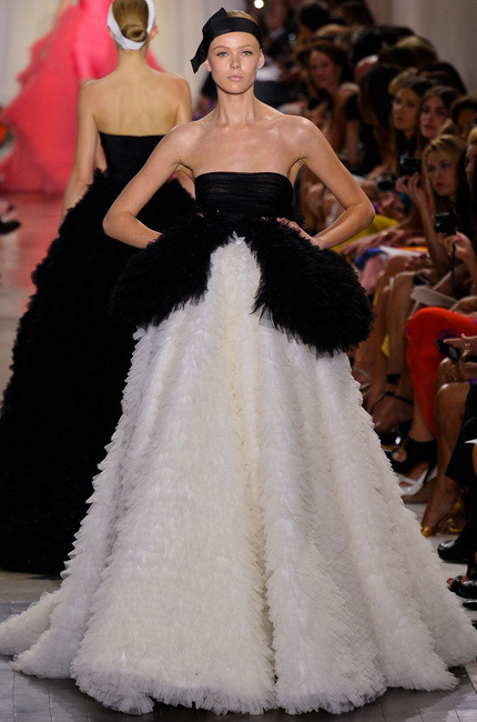 Très riches en détails luxueux, la collection Haute-Couture Automne Hiver 2011 de Giambattista Valli se partage entre un vestiaire de jour fait de robes, de vestes et de tailleurs jupes s’arrêtant au dessus du genou d’un côté et de longues robes du soir alternant avec de délicates robes de bal ou à traîne de l’autre.