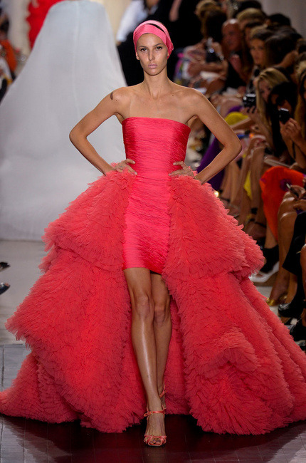 Veste à volants en soie bouclée portée sur un long jupon de ballerine, robes aériennes à l’imprimé léopard, délicates robes en mousseline de soie rouge lumineuse, robes trapèze plus classiques et vaporeuses robes de bal en tulle drapé sont autant de créations parfaites pour la très fidèle clientèle de Giambattista Valli.
