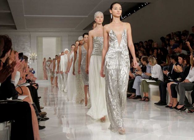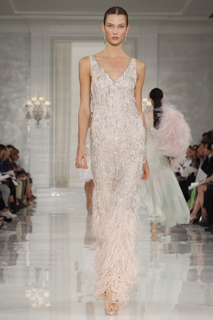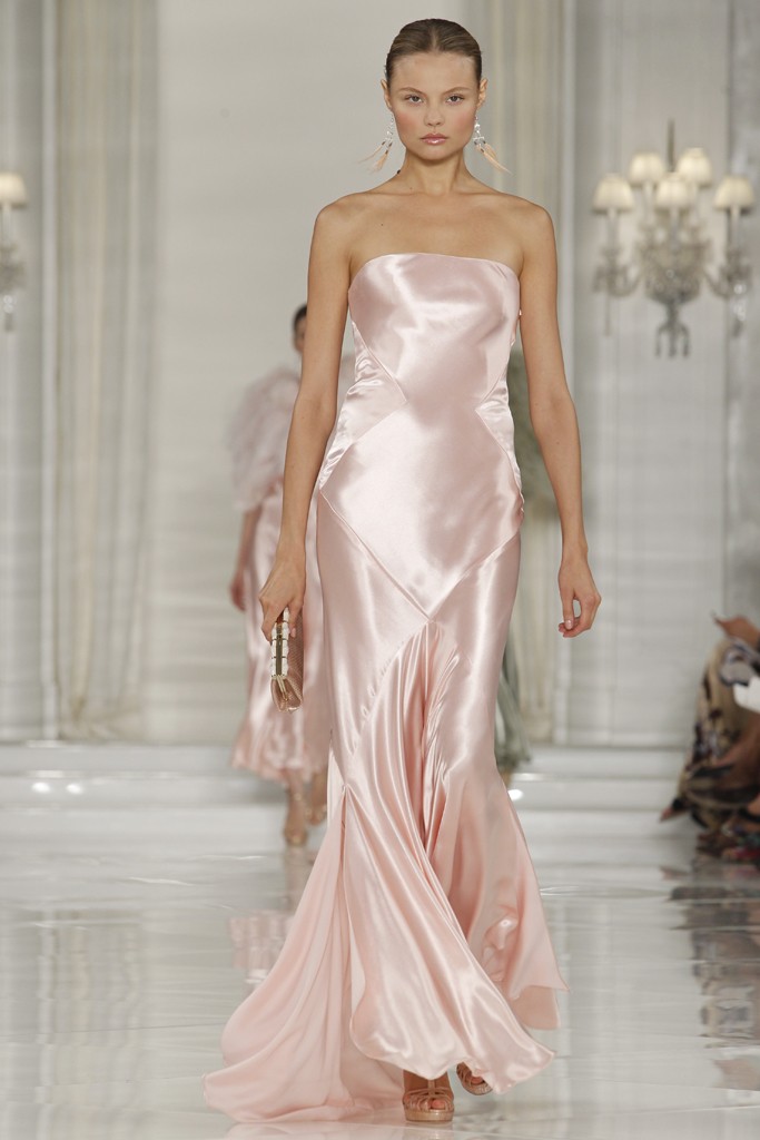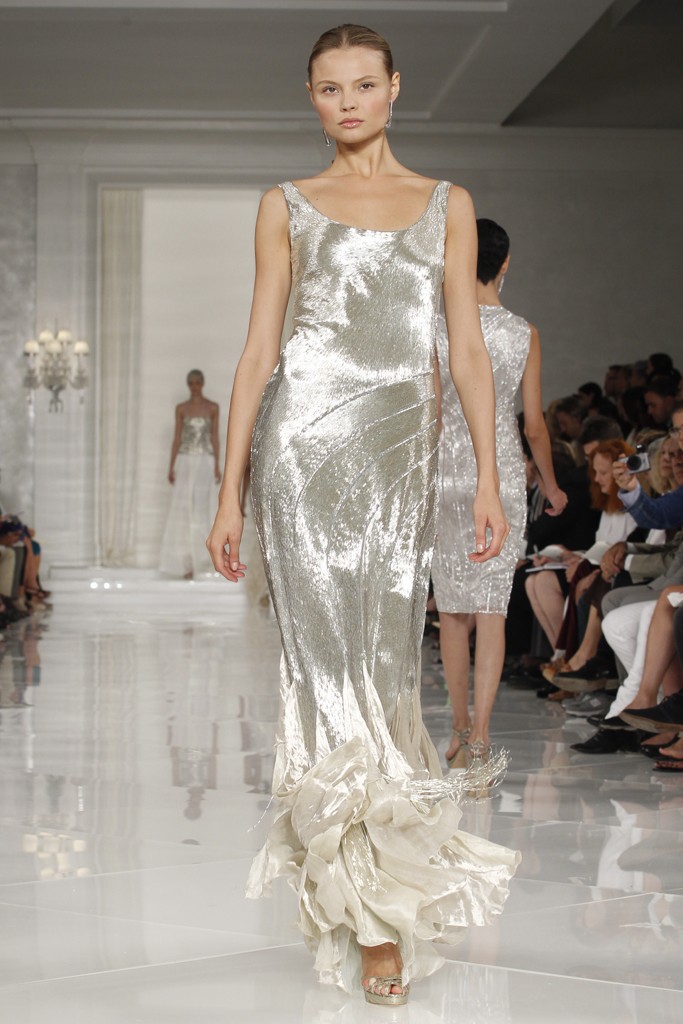 La femme Ralph Lauren se fond dans des fourreaux en satin rose ou en tulle ivoire perlé sur des motifs aux multiples broderies. Elle resplendit dans de somptueuses robes couleur argent.