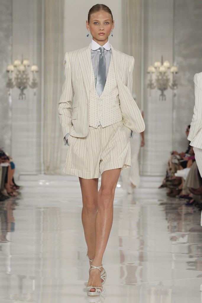La femme Ralph Lauren adopte les codes masculins et porte des costumes croisés d’hommes à rayures banquier en version pantalon ou bermuda avec cravate.