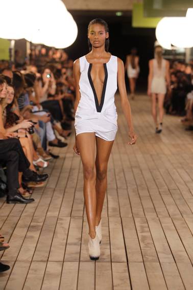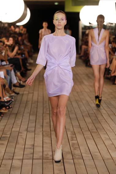 Multipliant les effets de matières, la collection est plurielle mais conserve une unité d’où se dégage une élégance certaine. La mousseline de soie et les mailles translucides apportent de la légèreté tandis que le gazar autorise toutes les structures amenant un peu de rigidité. Le raphia, le tulle, le jersey, le lin allié à la soie et le double taffetas s’épanouissent sur les créations d’une pureté diaphane.