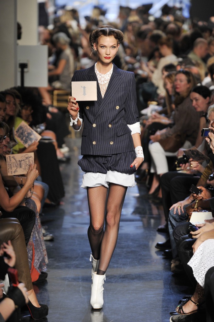 Le costume d’homme si cher au créateur revient sur le devant de la scène. Vestes et gilets d’homme à rayures et aux coupes amples recouvrent des chemises blanches aux manches découpées ou retroussées. Le short façon bloomer retroussé remplace un temps le pantalon large et s’accommode d’un collant résille des plus chics.