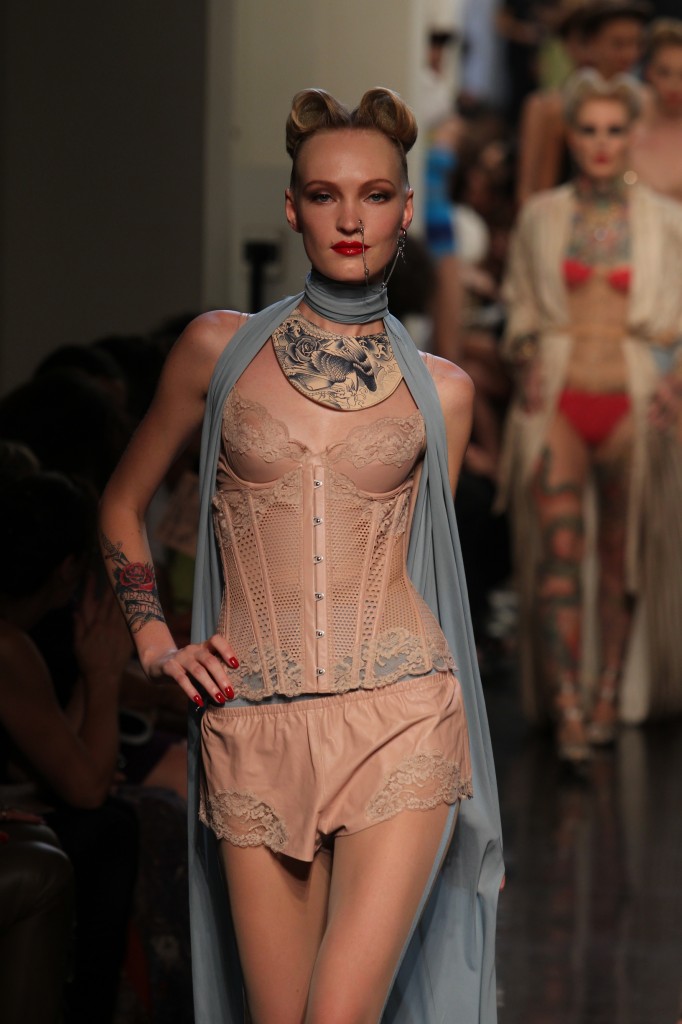 Corsets de cuir perforé, petite dentelle noire sur une mousseline beige évanescente, gaine et liquette en satin beige brodé, soutien-gorge en frous-frous, culotte corail et maillot bondage bleu électrique passent à toute allure devenant instantanément des must-have pour bien des femmes présentes dans l’assistance qui applaudissaient à tout rompre.