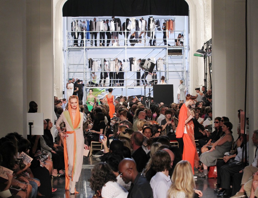 Un imprimé résille captivant, bientôt suivi d’un autre plus exotique, vient perturber une avalanche de silhouettes monochromes où l’orange flamboyant et le vert chartreuse dynamisent une collection à majorité noir et blanc multipliant les drapés.