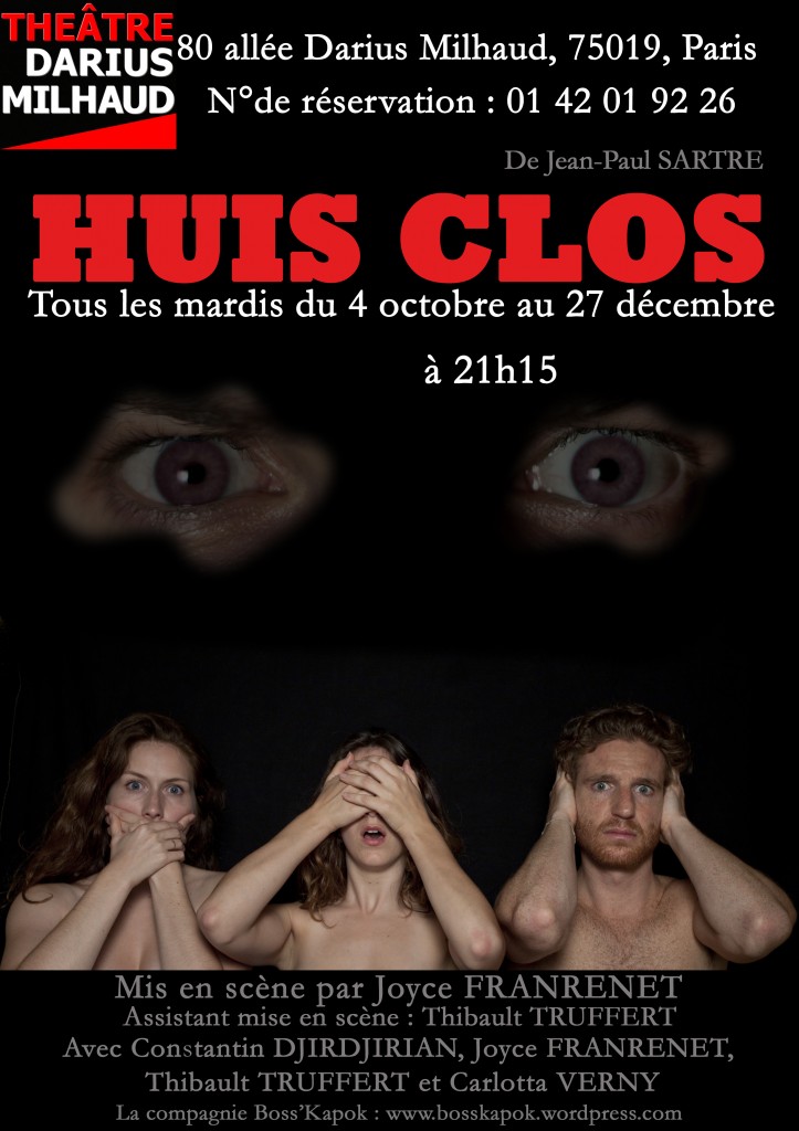 Les quatre acteurs de cette pièce constituent une parfaite illustration des concepts sartriens de honte et de mauvaise foi. Les trois personnages principaux apprennent à leurs dépens que L’Enfer, c’est les Autres et qu’en chacun d’eux se cache le bourreau des deux autres. Sur une mise en scène minimaliste mais dynamique de Joyce Franrenet, la jeune troupe nous livre une interprétation juste et intense d’un chef d’œuvre classique français.