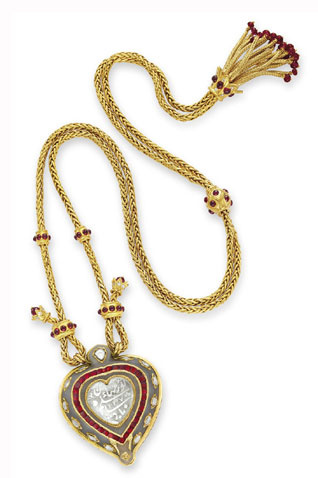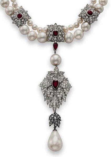 Un collier en rubis et diamants incorporant la fameuse perle Peregrina, imaginé par Elizabeth Taylor et réalisé par la Maison Cartier, fera également le ravissement de vos yeux. Richard Burton avait acheté 37.000 dollars dans une maison de vente en 1969 cette perle du XVIe siècle portée successivement par plusieurs reines d’Espagne et d’Autriche et qui figure sur des toiles peintes par Velázquez. Cette pièce unique est estimée entre 2 et 3 millions de dollars.