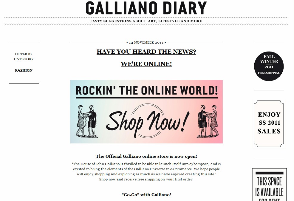 Le format gazette de la bannière du site évoque l’imprimé papier journal Galliano Gazette emblématique de la marque. Agencé comme un magazine, le site dispose d’un espace Online Store d’achats en ligne, d’un espace Collections permettant de consulter les différentes collections disponibles, d’une liste non exhaustive des points de vente et d’une section Diary permettant de suivre les dernières news de la marque.