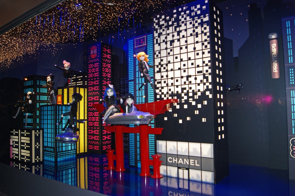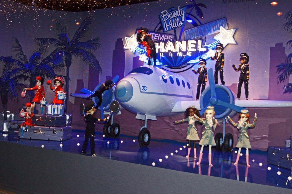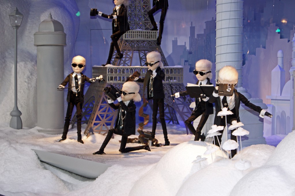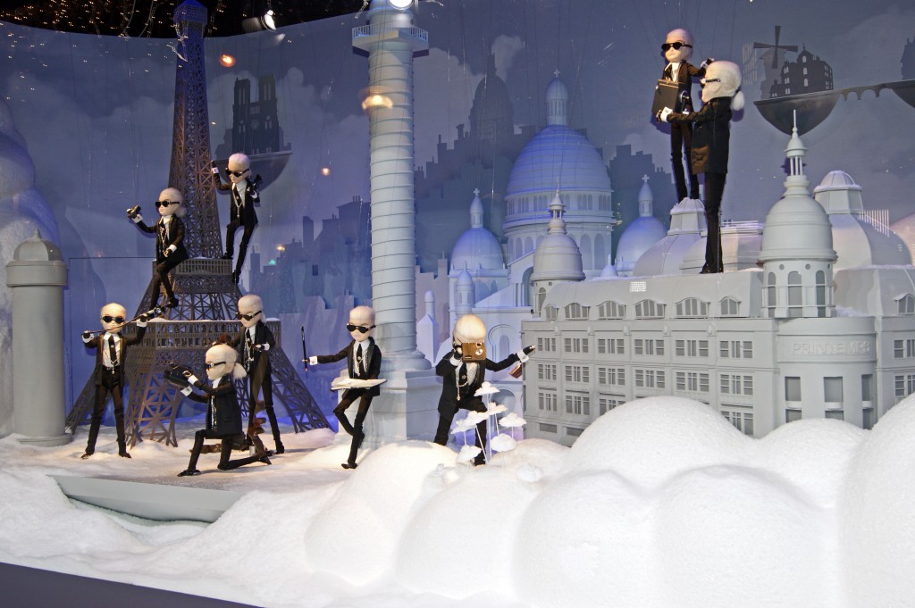 Et pour les fameuses vitrines animées – certainement les plus appréciées des enfants – Karl Lagerfeld a imaginé des couples de poupées griffées Chanel, pour les vitrines consacrées aux hauts lieux de la mode que sont Tokyo, Paris, Los Angeles et Moscou. Les soixante poupées utilisées pour ces vitrines sortent des ateliers haute couture de Chanel.