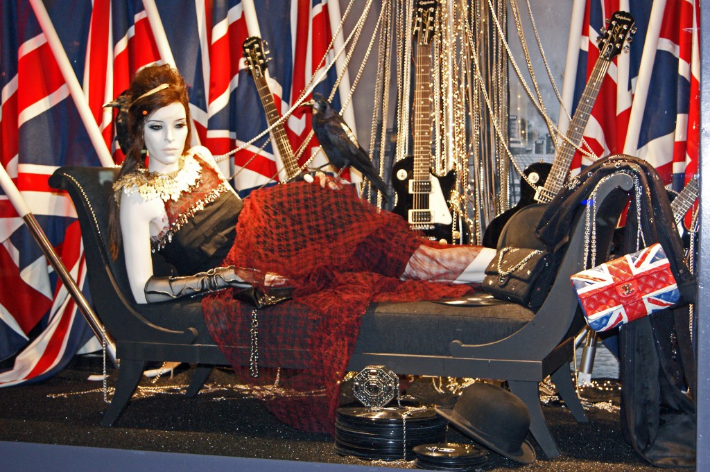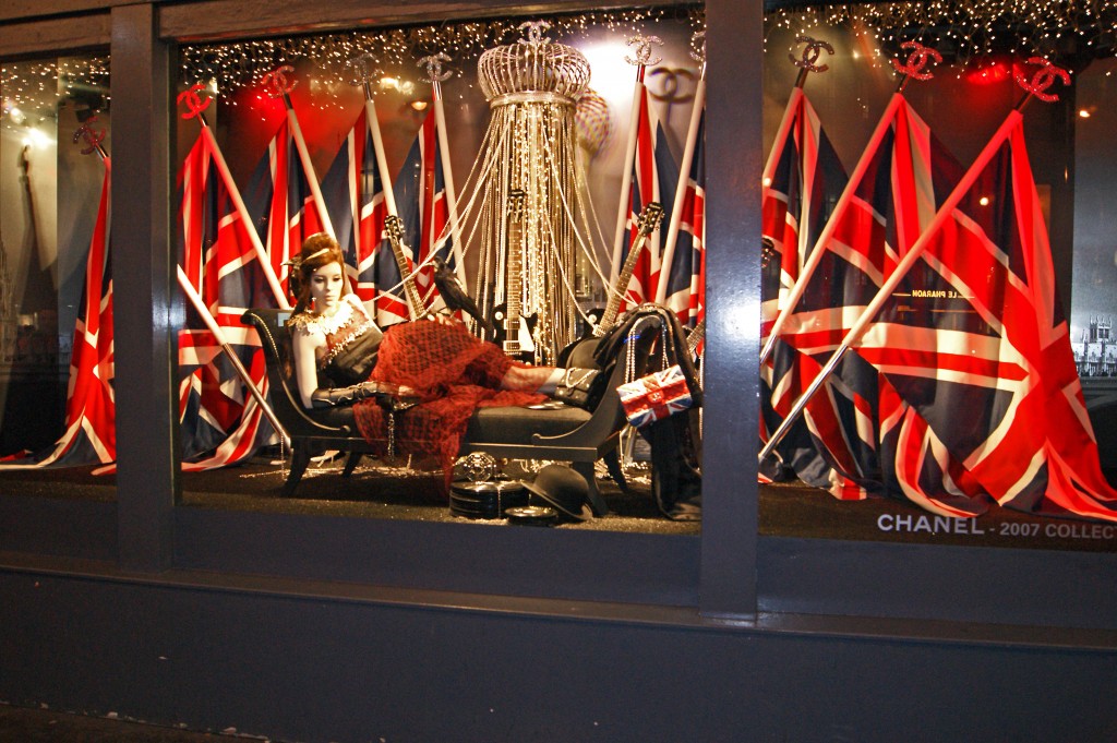 La vitrine Londres, Collection Métiers d’Arts 2007 reprend les codes chers à la perfide Albion. Tartan, chapeau melon et Union Jack cohabitent dans une vitrine où le double C trône au dessus des drapeaux. Et le fameux 2.55 aux couleurs de l’Union Jack.