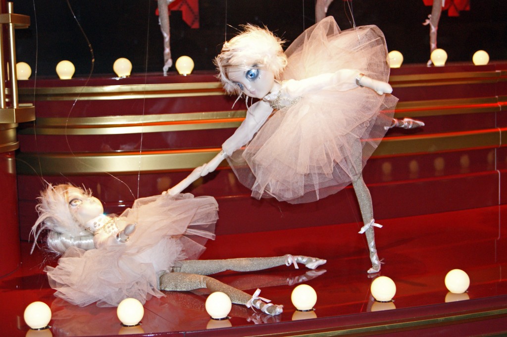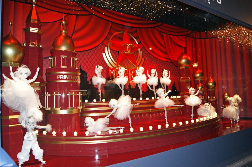La vitrine célébrant Moscou, Collection Métiers d’Art 2009, nous donne l’occasion d’assister à un ballet russe où l’une des danseuses chute et essaye péniblement de se relever aidée par sa voisine. Tutus blancs, fourrure et arabesques contrastent avec l’ambiance rouge de la vitrine.