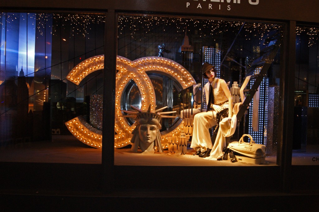 La vitrine New-York, Collection Croisière 2006-2007, nous offre une petite promenade dans les lieux emblématiques de la ville qui ne dort jamais. La Statue de la Liberté, King-Kong, l’empire State Building entourent le double C gigantesque. On sent l’esprit de Manhattan de Woody Allen dans la tenue du mannequin qui rappelle celle de Diane Keaton.