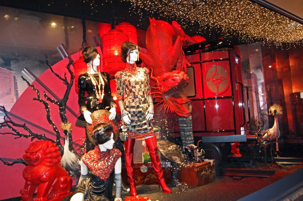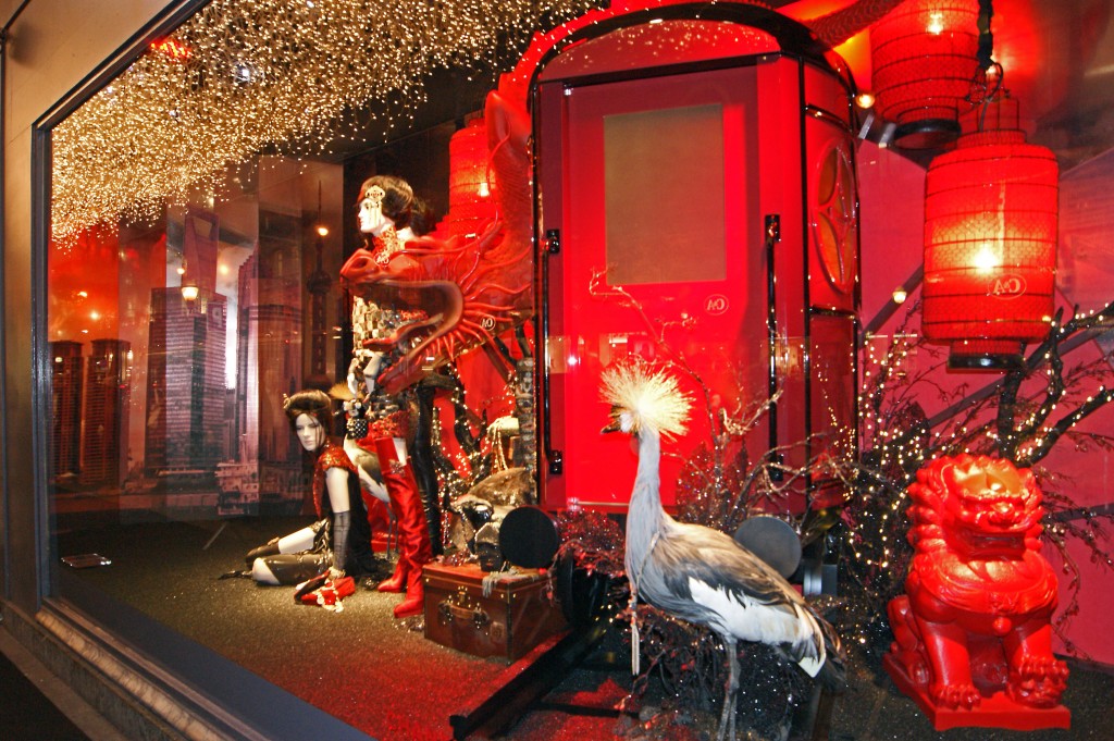 Placé sous le signe du voyage et du temps, Noël se décline sur onze vitrines, chacune représentant onze villes mythiques fêtant Noël chacune à leur manière et rendant hommage à l’une des plus grandes maisons de couture.