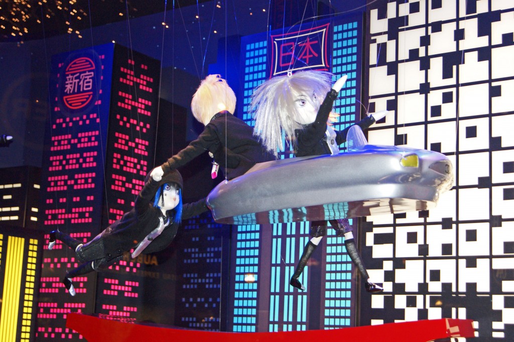 La vitrine consacrée à Tokyo nous offre une promenade dans un Tokyo futuriste qui n’est pas sans rappeler le décor du film « Le 5e élément« . Esthétique graphique, univers fantasmé dans un monde clinquant où les poupées deviennent des personnages de mangas acrobates dansant sur les toits d’une ville illuminée.