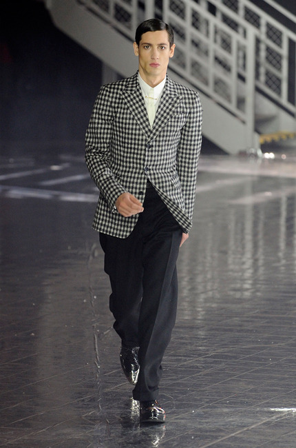 L’homme Galliano version Al Capone porte des pantalons amples en tweed lorsqu’il ne revêt pas ses célèbres costumes croisés rayés qu’il prend soin de recouvrir de manteaux oversize en cuir verni. Il n’abandonne jamais son fedora recouvrant ses cheveux impeccablement coiffés.