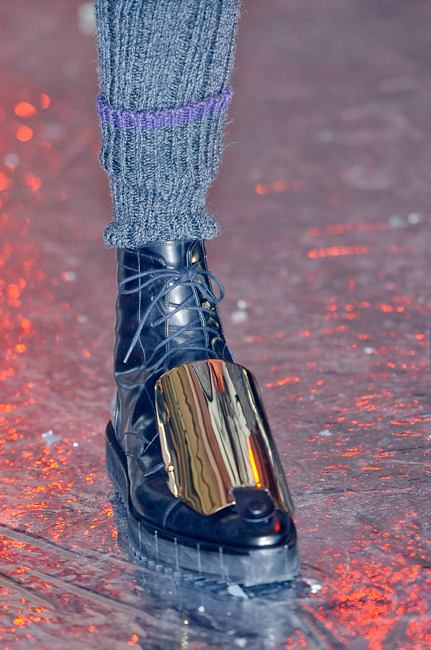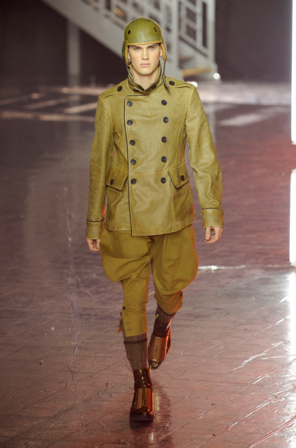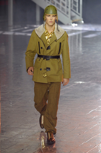 Et soudain l’ombre de Charles Lindberg, héros national mais personnage très controversé, semble planer sur le défilé. Coiffés de couvre-chef rappelant à la fois les casques d’aviateurs et ceux des footballeurs de l’époque, les modèles portent des pantalons rappelant les jodhpurs, larges au niveau de la cuisse et serrés au mollet, portés par les aviateurs dans les années 30.