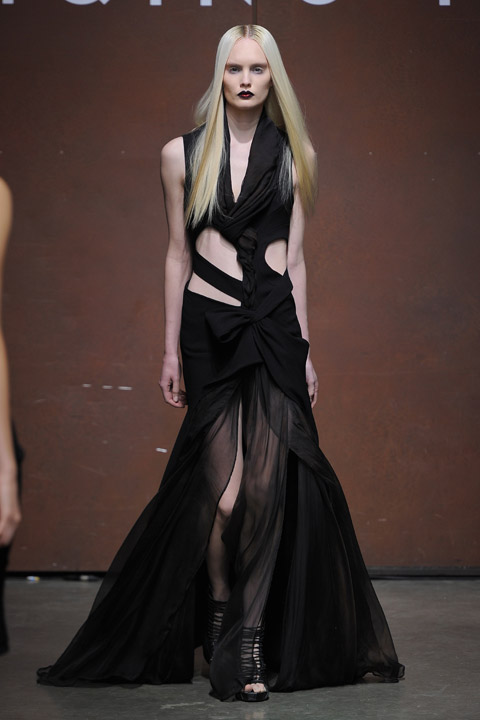 On ne peut qu’admirer le travail des drapés et des plissés sur du jersey ou de l’alcantara rapprochant son travail de celui de la sculpture. Superposition de matières, fragiles dentelles, drapés éthérés habillent la silhouette sans l’alourdir laissant la femme maîtresse de ses mouvements dans des nuages d’organza. Jersey, soie, cristaux, velours et fourrure se mélangent et s’intègrent au corps dans des teintes blanches, grises, noires, dorées et ocre.