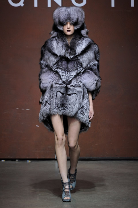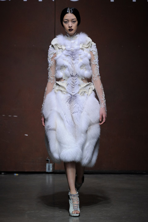 La femme Yiqing Yin se fait parfois animale comme dans cette étonnante robe manteau introduisant la fourrure de renard argentée rasée. Parfois, cette étonnante fourrure rasée se mêle à la dentelle dans un ensemble fragile mais de toute beauté à la sophistication de rigueur.