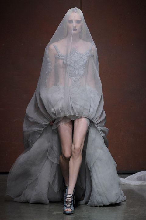 Ici, une grande robe aérienne comme un nuage blanc cache un visage de vieux sage dans son plissé. Là, un voile recouvre délicatement le haut du mannequin. On ne fait que deviner le bustier avant de pouvoir l’observer longuement au fur et à mesure que le mannequin se rapproche de nous. Le volume trouve ses lettres de noblesse.
