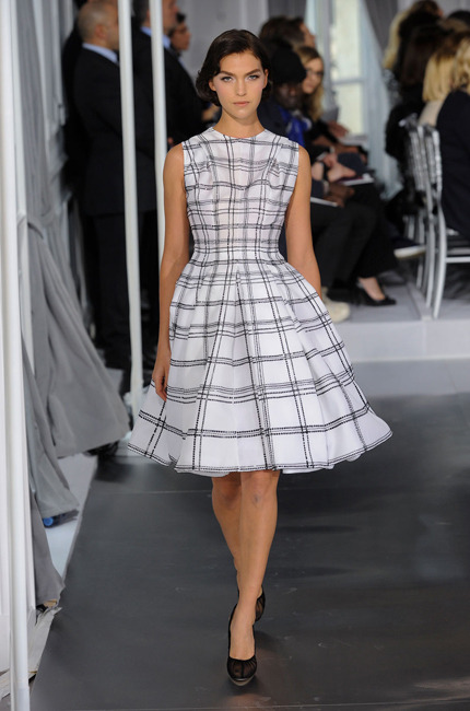 Un instant, la femme Dior se fait graphique privilégiant les imprimés structurants. Le pied-de-poule fait son grand retour en version surdimensionné. Graphique, il habille un haut aux épaules arrondies et se réinvente en rouge sur une jupe crayon. Le tartan pare de lignes noires et blanches harmonieuses des robes flattant la silhouette.