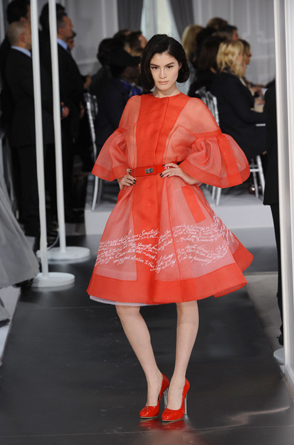 Le savoir-faire des ateliers Dior se matérialise dans des robes aux jupes volumineuses, souvent plissées, où se succèdent jupons et broderies délicates. Fleurs, poèmes et paillettes ponctuent le bas de manteaux ou de robes.