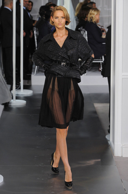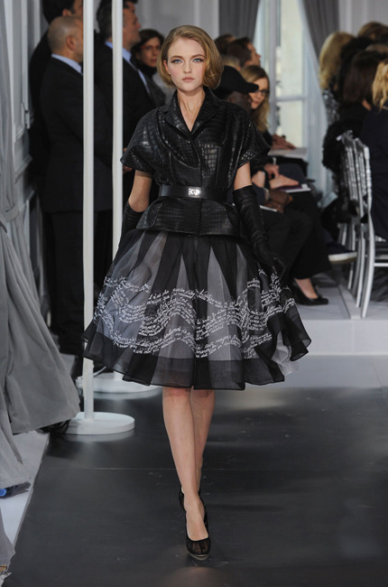 Les modèles sont ceinturés à la taille, les jupes se font corolle en s’évasant tout en volumes. De longs gants en cuir viennent ponctuer certaines silhouettes. La veste Bar, emblématique de la Maison Dior, prend son envol en crocodile noir.