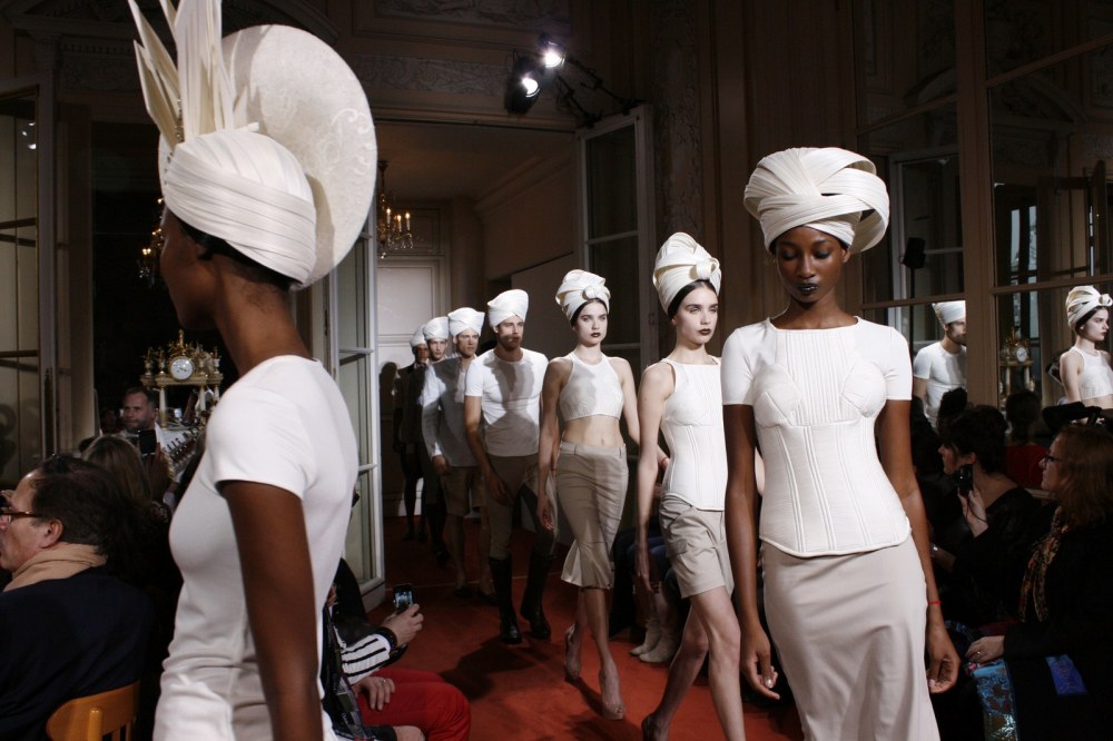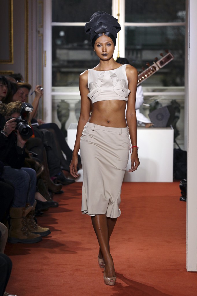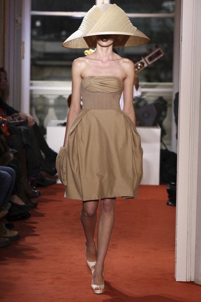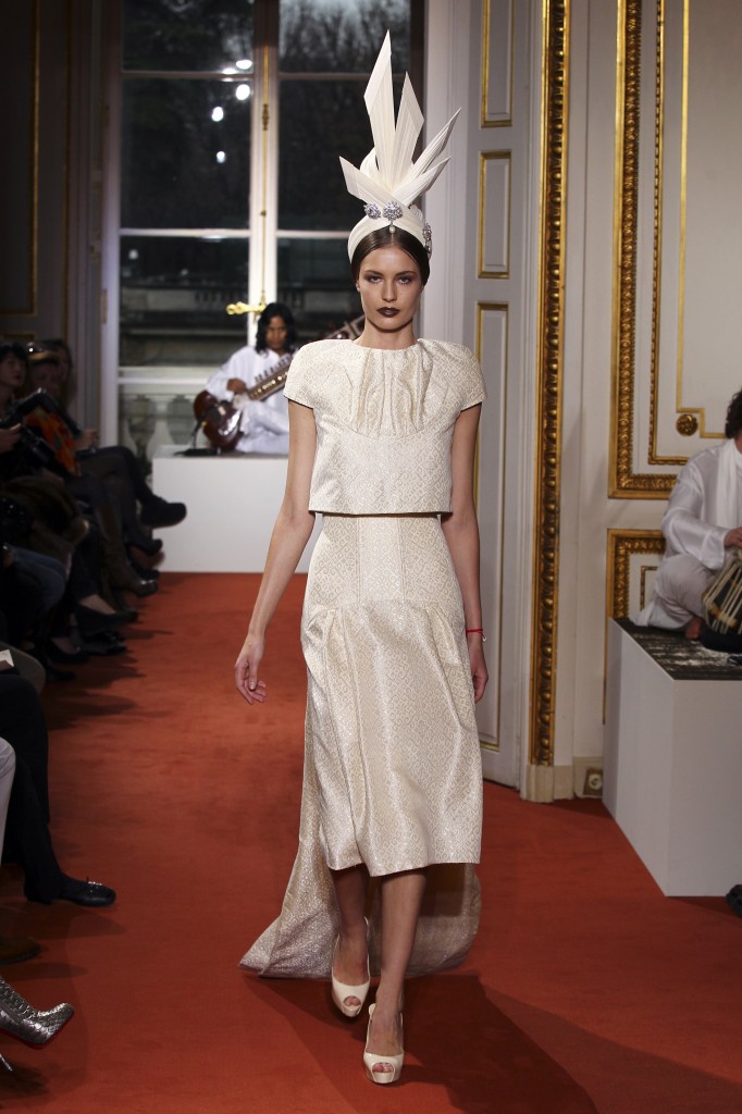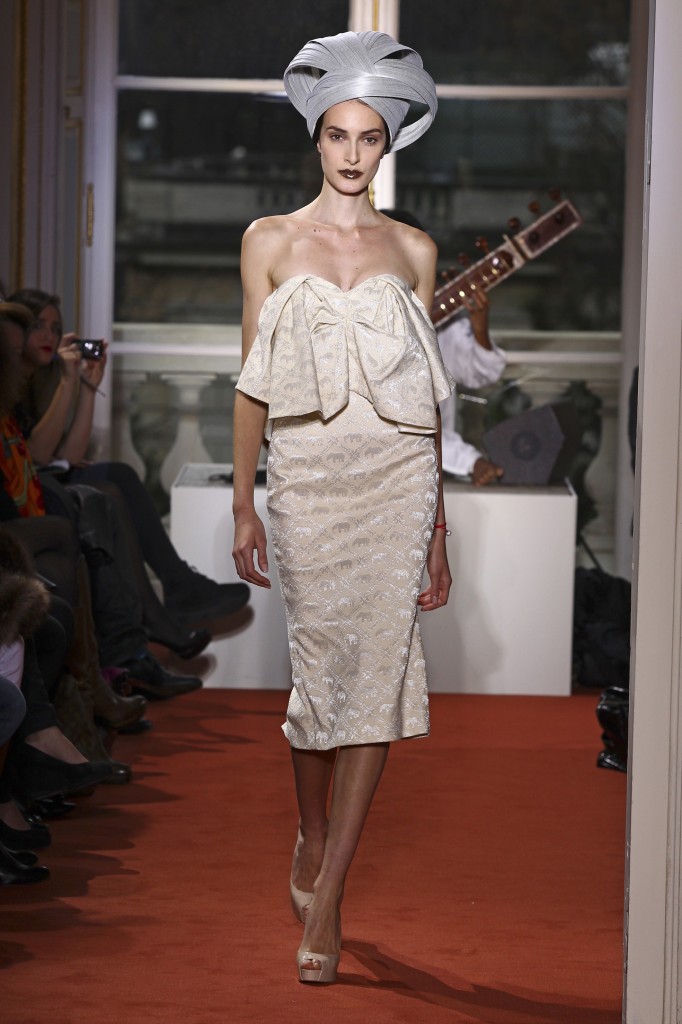 Le voyage est total à la fois dans le temps et à travers les continents, dans des teintes beige, marron, blanche et camel. Bercés par le son de la sitar, nous découvrons des silhouettes élégantes coiffées de majestueux turbans ou de chapeaux en fibres végétales sortant de l’imagination de Philip Treacy.