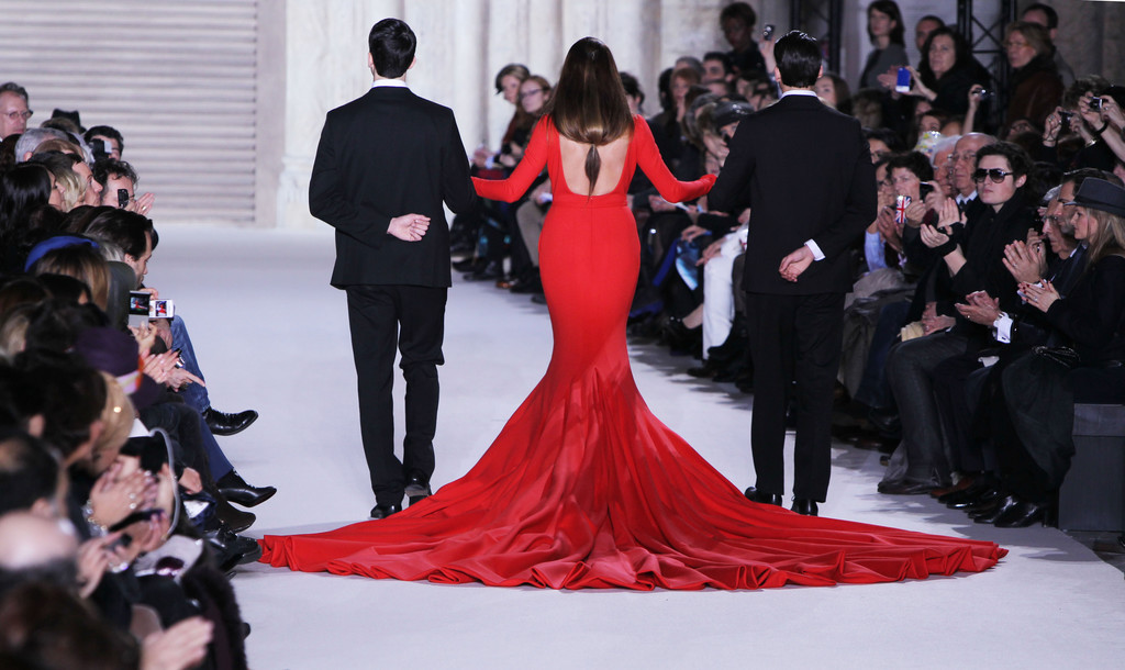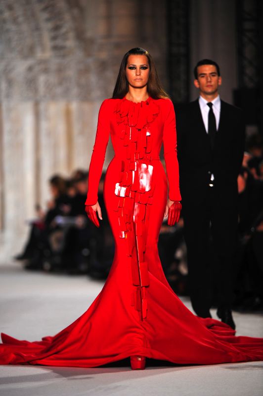 Puis vient la sculpture ultime. Tel un trait de peinture rouge foudroyant, la muse du créateur Yasmin Le Bon fait son entrée dans une robe de mariée sculpturale en version rouge laquée. Aidée par ses deux gardes du corps, elle se déplace lentement nous permettant d’admirer le travail d’architecte de la mode du couturier sur une longue traîne en jersey époustouflante.