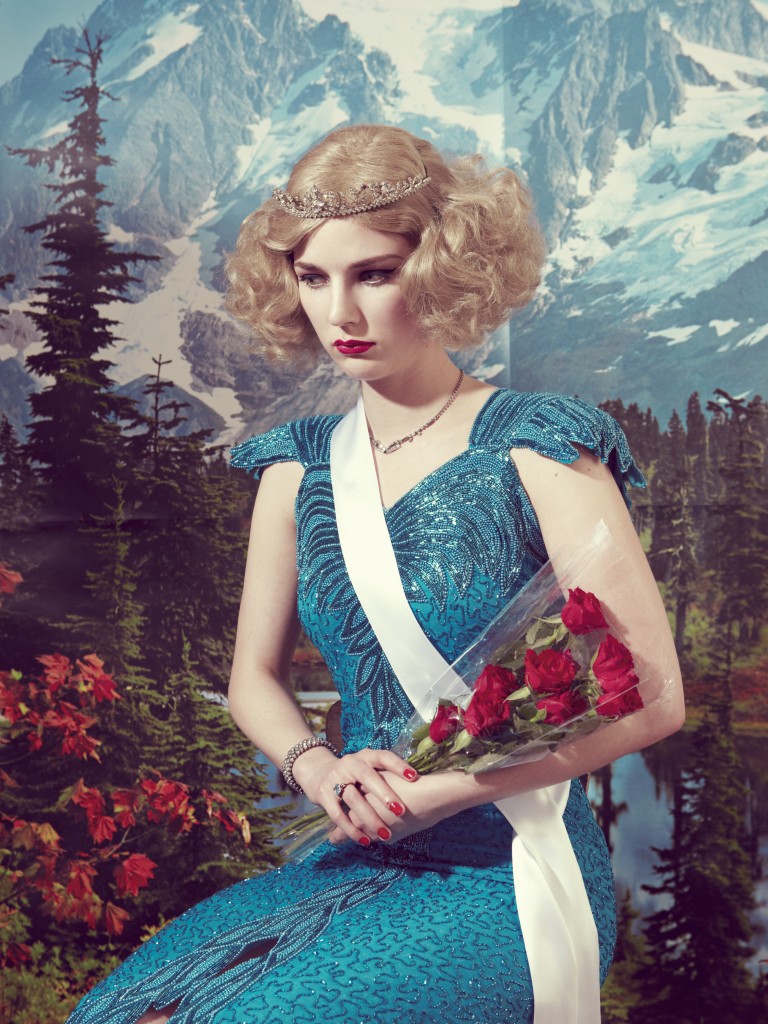 Ideal Woman de Kourtney Roy est une série d’autoportraits qui emploient les stétérotypes kitsch de la femme inspirée par les publicités, le cinéma et la pornographie des années 50, 60 fixée dans un paysage idéal – un paysage de montagnes -, la femme s’ennuie indolente à l’image d’une femme prisonnière de son image.
