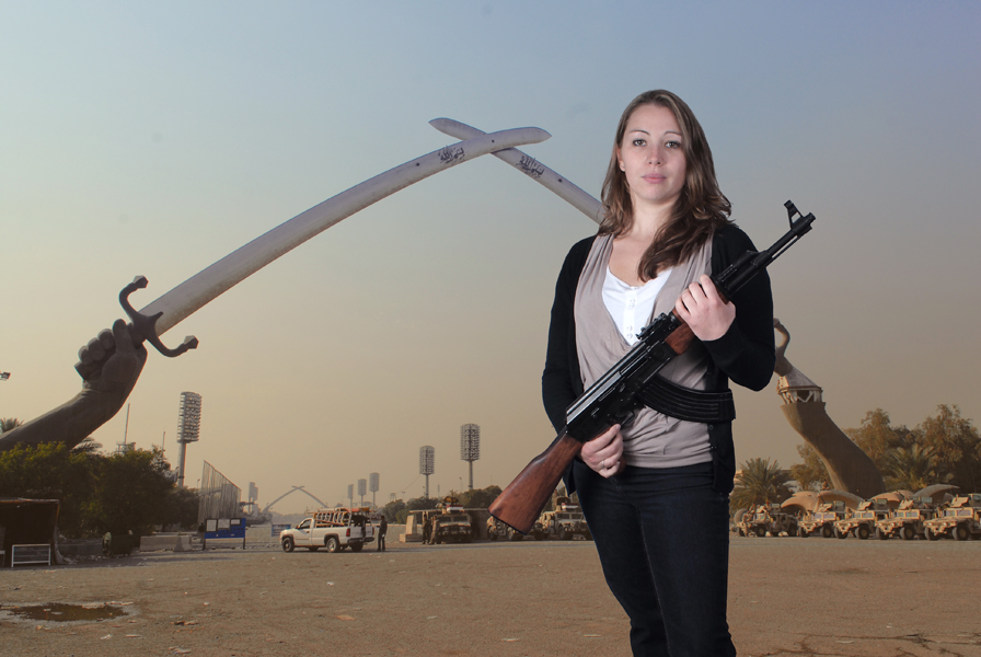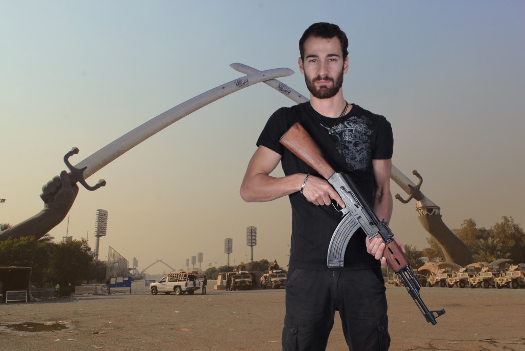 Autre artiste invité, Émeric Lhuisset nous propose d’aller au delà du cliché avec sa série Souvenirs en l’exposant pour mieux en montrer la bêtise. Avec son stand interactif, l’artiste nous propose de poser dans son studio une Kalachnikov AK-47 à la main sur fond devant une bâche tendue représentant les Sabres de Qadisiyah, monument emblématique de Bagdad, arc de triomphe d’une défaite déguisée en victoire.