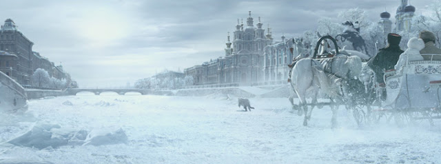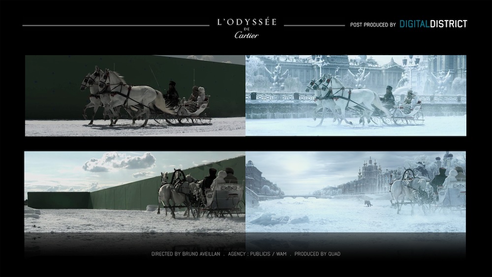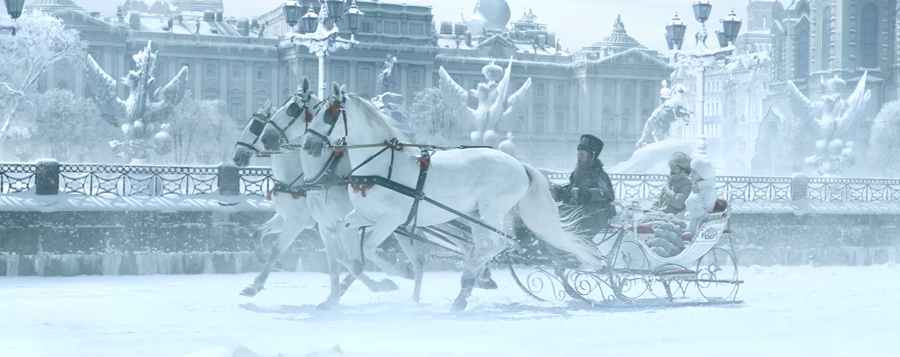 L‘Odyssée de Cartier rend également hommage au pays des Tsars à travers une formidable scène de traîneau. En effet, dès le début du XXème siècle, la maison Cartier conquiert l’aristocratie Russe qui se passionne pour le goût Parisien. Tout le savoir-faire de Digital District a résidé dans la capacité à rendre réels dans cette scène la magie et le lyrisme chers à Bruno Aveillan.