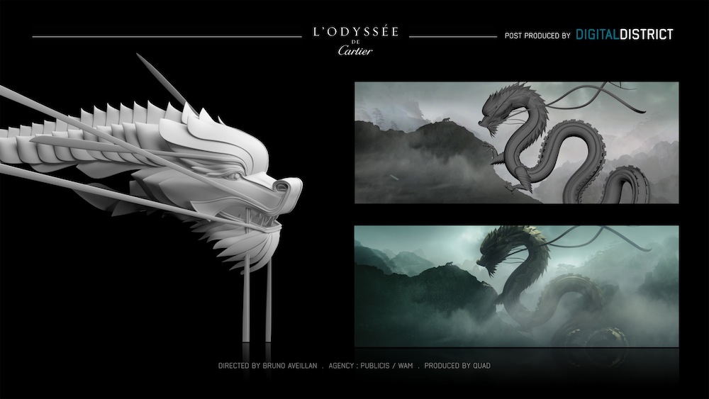 Dans cette séquence, le réalisateur Bruno Aveillan fait référence à la collection Chimera et met ainsi en scène un dragon au corps forgé d’or, de jade et de pierres précieuses. Le réalisme de ses interactions allié à la fluidité de ses déplacements, reflète l’habileté des animateurs et des flamistes du studio qui imposent cette créature improbable tel un personnage charismatique et divin.