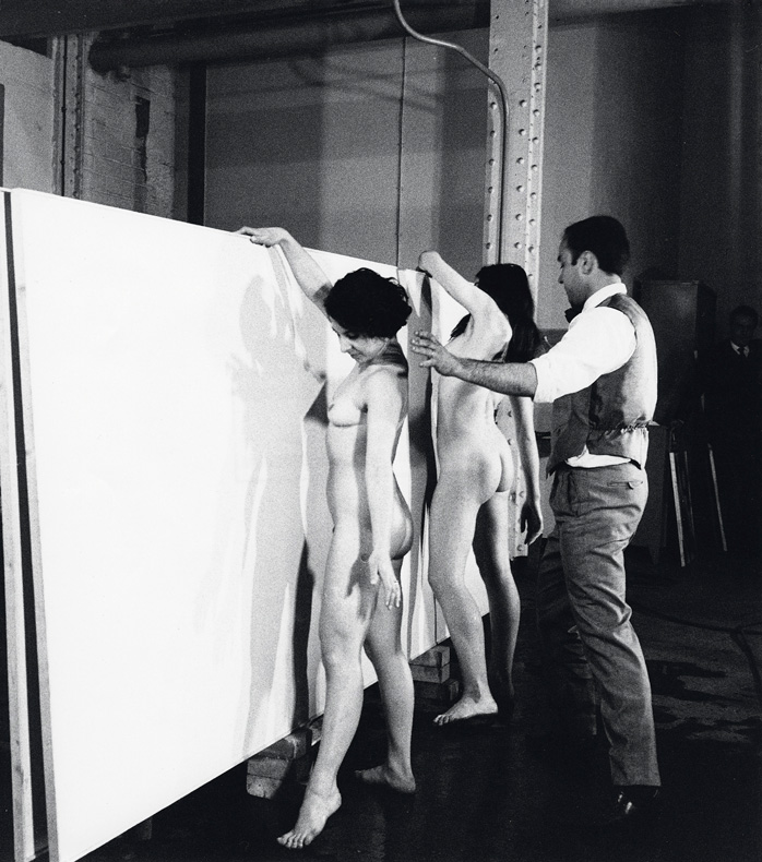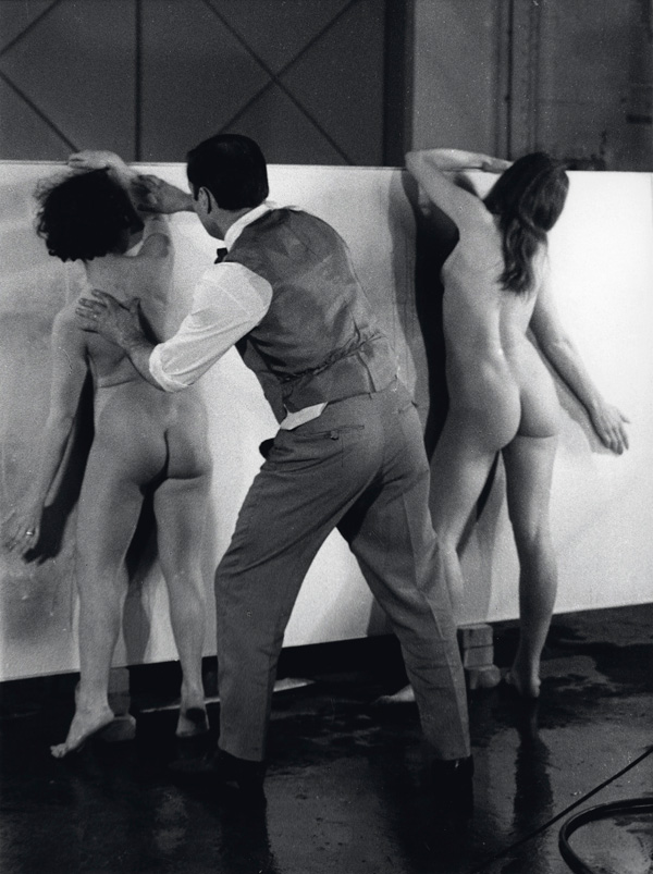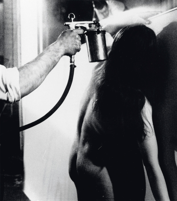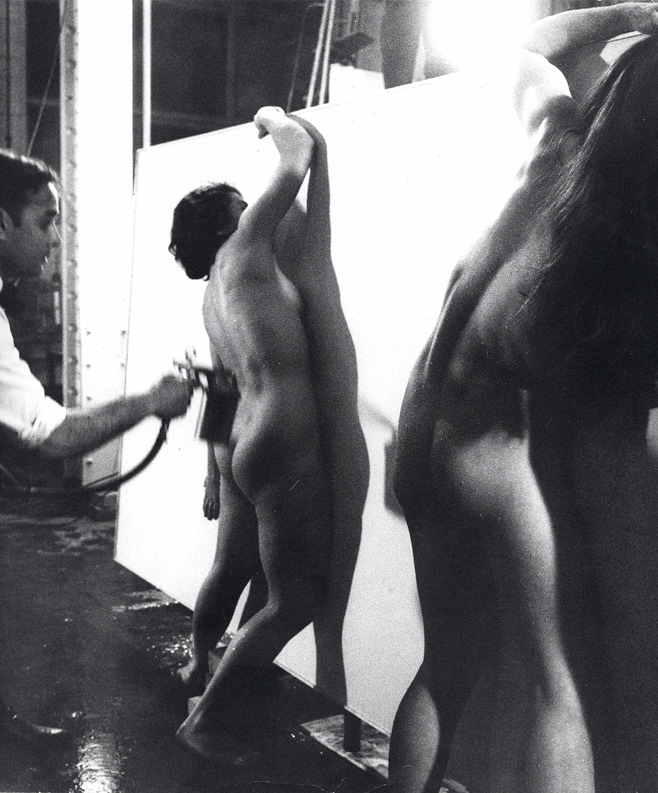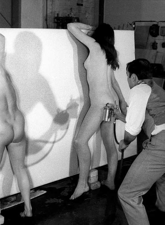 Les mêmes modèles sont ensuite revenues se plaquer sur la toile, enduites de peinture bleu Klein, imprimant ainsi des anthropométries, ou techniques des pinceaux vivants, les contours de leurs corps étant vaporisés de peinture à l’aide d’un aérographe afin de souligner leurs silhouettes. Le corps fait ainsi le tableau dans une danse hypnotique, l’artiste fasciné par les 4 éléments est en retrait laissant son sujet prendre le pas sur son propre désir.