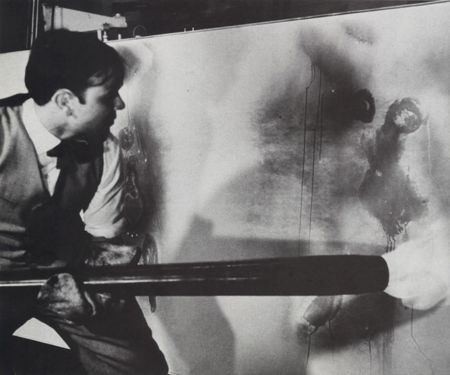 Sur un panneau de 3 mètres de long, l’artiste a figé au lance-flammes les silhouettes chorégraphiques de deux femmes – qu’il appelait ses » femmes pinceaux » – enduites de peinture et d’eau.