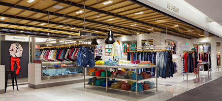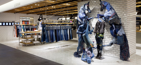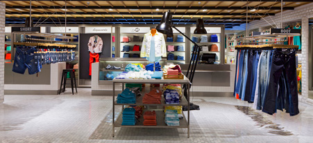 Proposant le meilleur de l’offre de jeans actuelle, ce nouvel espace nous transporte de l’autre côté de l’Atlantique avec un décor rappelant l’esprit des « Délicatessen » new-yorkais aux murs recouverts de carrelage en faïence blanche. Des portants métalliques suspendus offrent à l’œil les coupes phares (slim, bootcut, flare, boyfriend…) toutes marques mélangées. Des frigos alimentaires servent d’armoires.