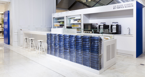 Prenez une pause azurée au Café Diesel, endroit unique et éphémère situé au niveau -1 du Printemps de la Mode. Entre deux essayages, vous pourrez ainsi faire une pause, boire un café ou manger confortablement installés dans des canapés Chesterfield en jean ou attablés à la table d’hôte les délicieuses spécialités de Tartes Kluger.