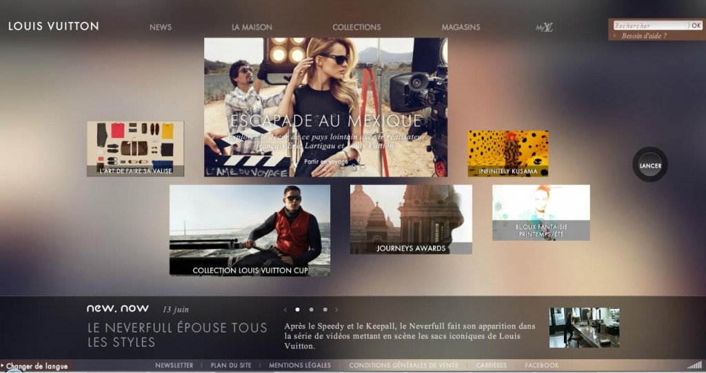 Première maison à avoir développé une stratégie numérique totalement intégrée -“The Art of Travel by Louis Vuitton” – la Maison Louis Vuitton conforte ainsi sa place de leader en stratégie digitale. Son site au design épuré, d’une très grande qualité graphique, nous offre un fabuleux voyage au sein de la marque au monogramme. Dès la première page, la disposition en mosaïque du site met en avant les différentes actualités de la marque.