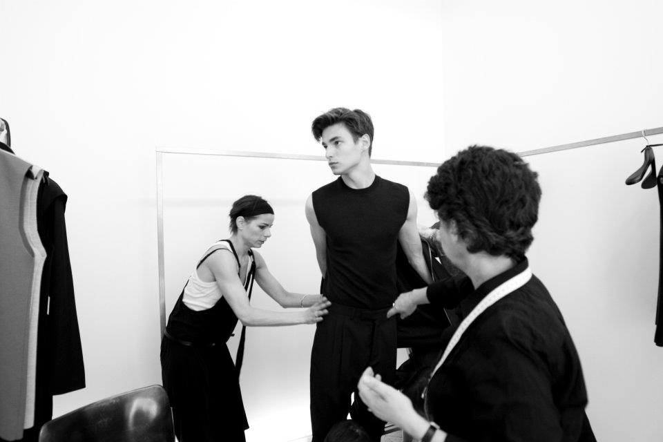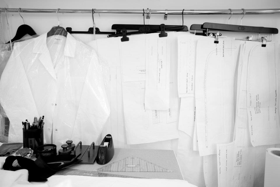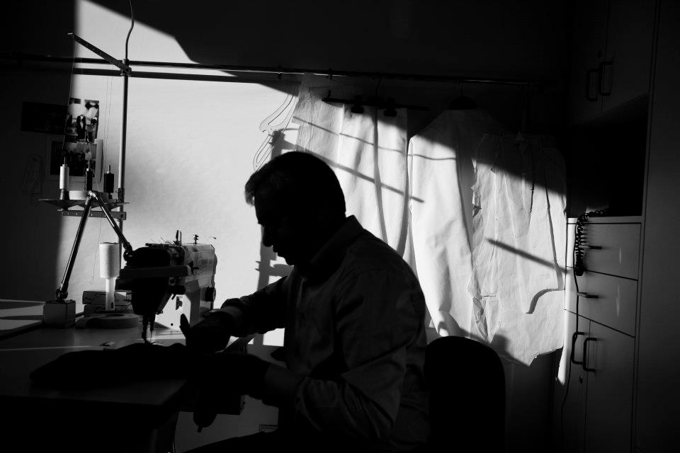 Trop souvent dans l’ombre des grandes maisons, les ateliers où règnent les petites mains sont la force vive des grandes maisons. La confection prend alors tout son sens jusqu’au dernier essayage quelques jours avant le show. Là, un tissu frôle une table, une paire de ciseaux se « repose sur une table » à côté d’une boîte d’épingles, des hommes dans l’ombre donnent vie aux croquis sortant de l’imagination du designer. Ils sont l’âme de la Maison Dior Hommes.