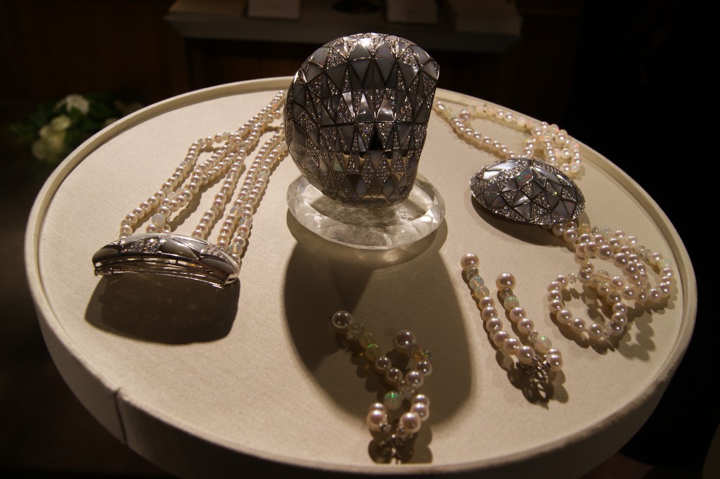 La sphère s’ouvre, dévoilant un collier, un bracelet et deux broches aux fermoirs discrets mêlant les perles à la nacre, aux diamants et à l’opale. Chacune des merveilles révélées se module, s’assemble avec les autres créant un nouveau bijou polymorphe au gré des envies.