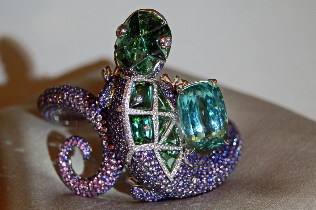Ainsi le bracelet Nature de Cristal est une vraie merveille de savoir-faire. Son dôme en cristal de 63,15 carats est serti à l’intérieur et à l’extérieur de diamants. En son centre des diamants coussin, baguette et rond sont montés sur or blanc. Le petit pompon qui orne le fermoir peut s’ôter et devenir broche ou pendentif.